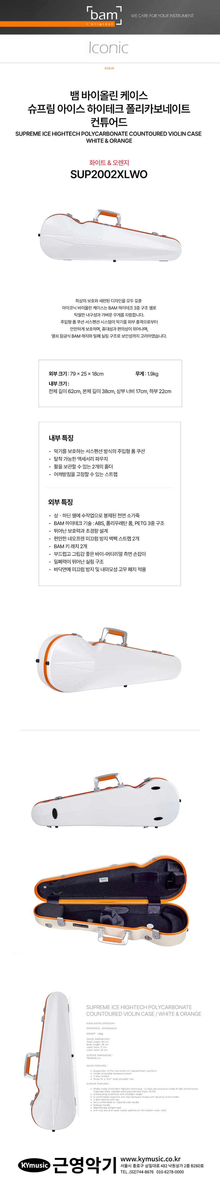 [Bam] 뱀 바이올린 케이스 슈프림 아이스 하이테크 폴리카보네이트 컨튜어드 화이트 & 오렌지 SUP2002XLWO